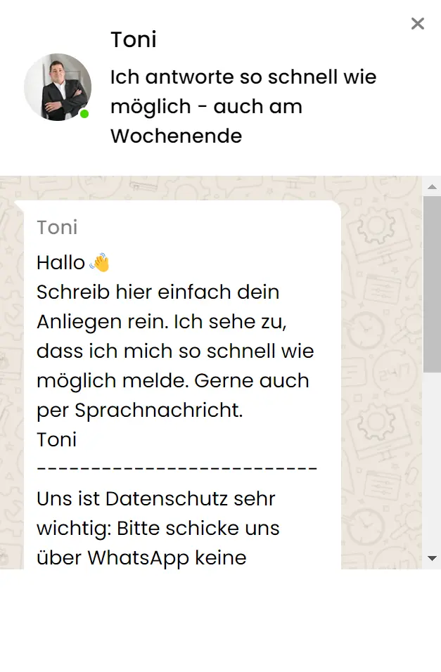 Schreib hier einfach dein Anliegen rein. Ich sehe zu, dass ich mich so schnell wie möglich melde. Gerne auch per Sprachnachricht.