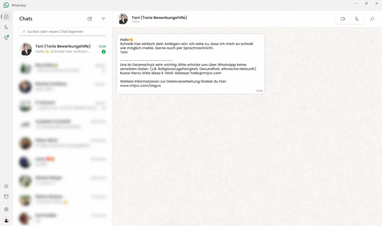 Uns ist Datenschutz sehr wichtig: Bitte schicke uns über WhatsApp keine sensiblen Daten. (z.B. Religionszugehörigkeit, Gesundheit, ethnische Herkunft).